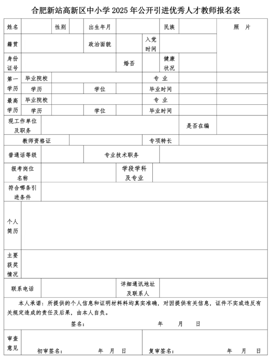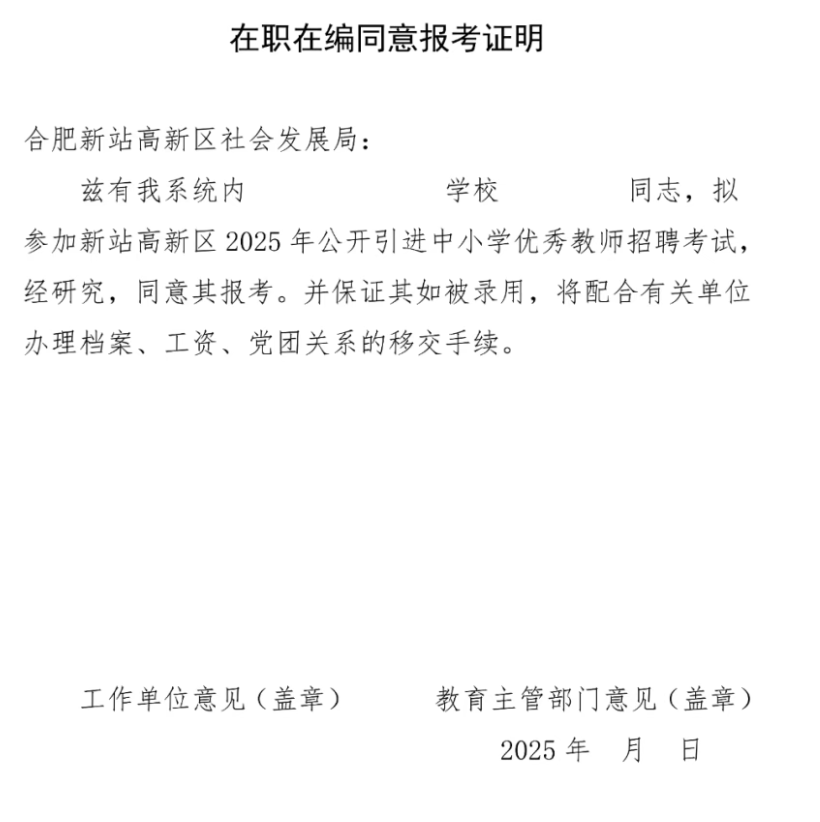 现场报名需提供材料:需提前下载并填写《合肥新站高新区2025 年公开引进中小学优秀教师报名表》(附件 1),同时携带符合报考条件的相关证明材料原件及复印件各一套,包括有效身份证、学历证书、教师资格证书、资质获奖证书或荣誉证书,以及《合肥新站高新区中小学2025年公开引进优秀人才教师证书清单》(附件 2)。此外,在编人员还须提供所在事业单位及主管单位同意报考的证明(见附件 3)。