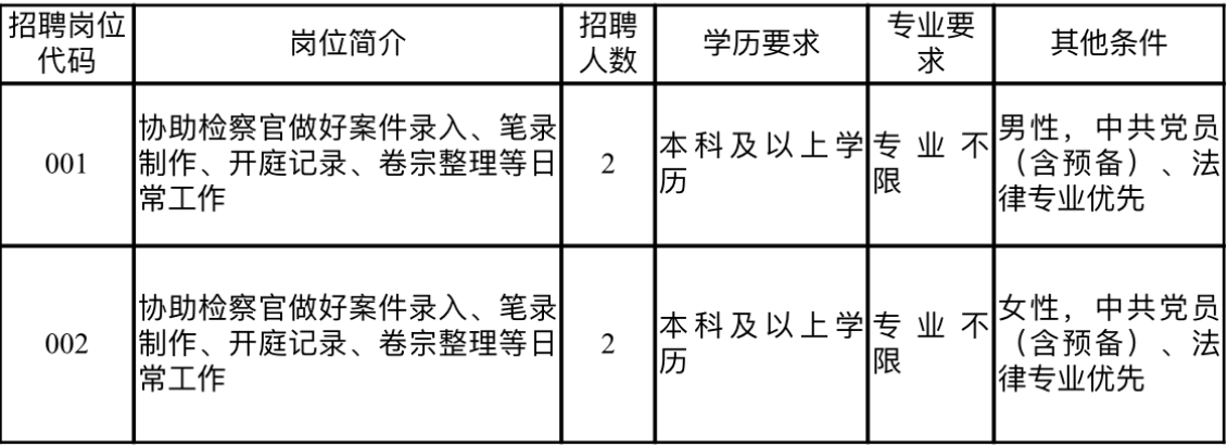 因检察工作需要,按照“自愿报名、公平竞争、择优录用”的原则,现拟向社会公开招聘公益性岗位工作人员。具体事项公布如下: