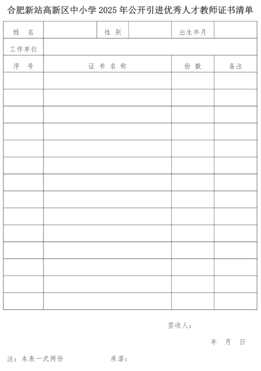 现场报名需提供材料:需提前下载并填写《合肥新站高新区2025 年公开引进中小学优秀教师报名表》(附件 1),同时携带符合报考条件的相关证明材料原件及复印件各一套,包括有效身份证、学历证书、教师资格证书、资质获奖证书或荣誉证书,以及《合肥新站高新区中小学2025年公开引进优秀人才教师证书清单》(附件 2)。此外,在编人员还须提供所在事业单位及主管单位同意报考的证明(见附件 3)。