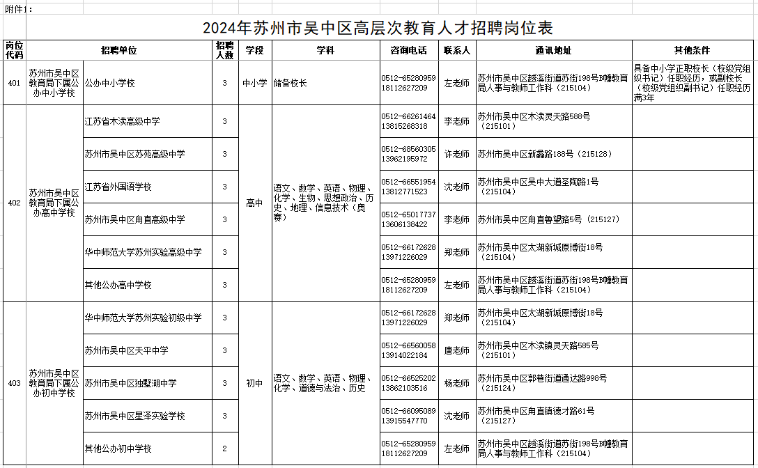 (三)邮寄地点及联系人:见《2024年苏州市吴中区高层次教育人才招聘岗位表》(附件1)。