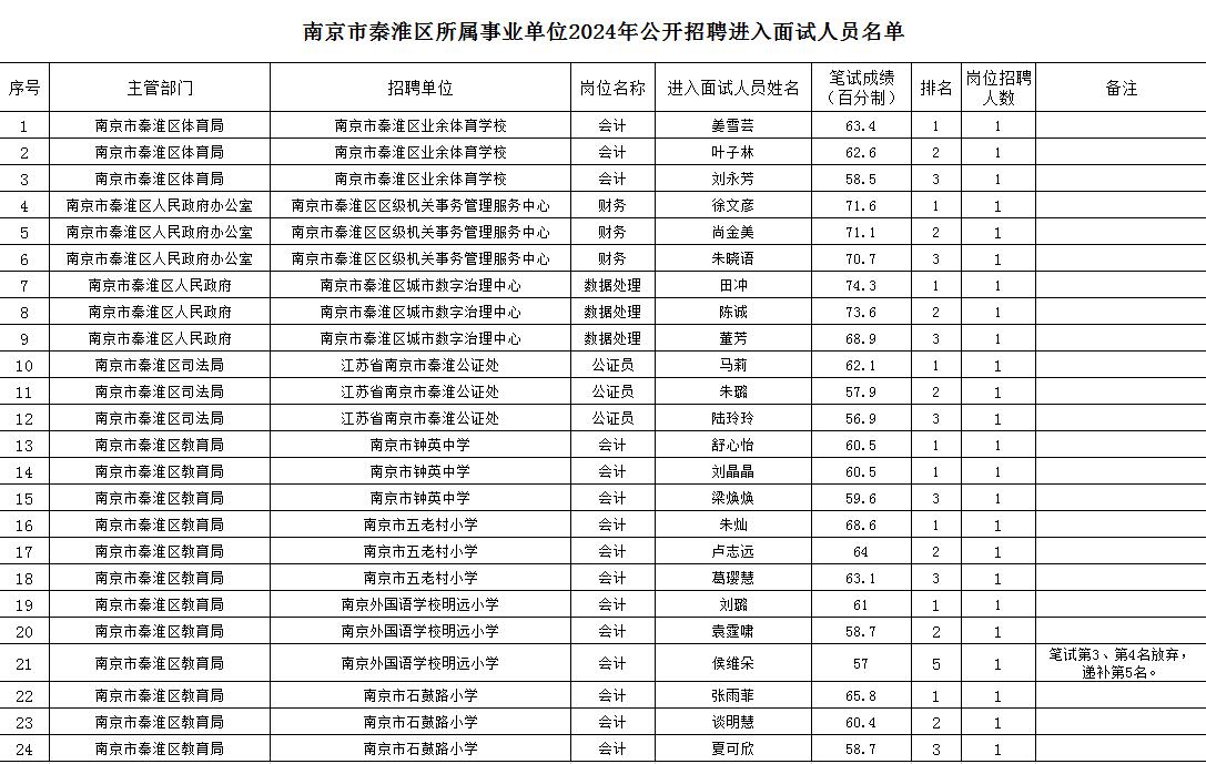 根据《南京市2024年事业单位统一公开招聘工作人员公告》(宁事招公告﹝2024﹞1号),经资格审查,现将南京市秦淮区所属事业单位公开招聘进入面试人员名单进行公布。请相关人员按招聘单位通知要求,做好面试准备。