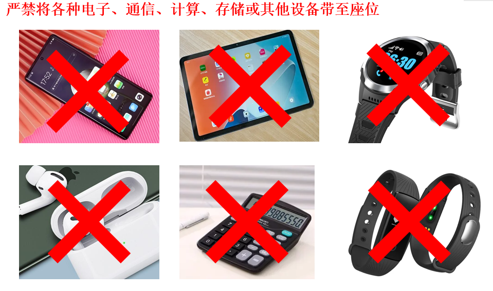 2.进入座位前,应按监考人员要求,将规定可携带文具以外物品放在指定位置,手机等通讯工具应关闭闹钟并关机。严禁将手机、智能手表、智能手环、蓝牙耳机等各种具有发送或者接收信息功能的通讯工具和具有计算、存储功能的电子设备带至座位。否则,无论是否使用均视为违纪。