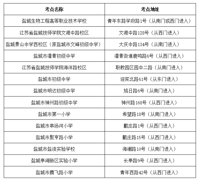 我市共设14个考点。请考生仔细查看准考证上的考点学校名称、地址、考场号、座位号,以及考点进入的大门。提前熟悉考点考场位置,规划好时间和行车路线。考试当天考点周边可能会拥堵、停车不便,请提早出门,预留足够时间,防止迟到不能入场。