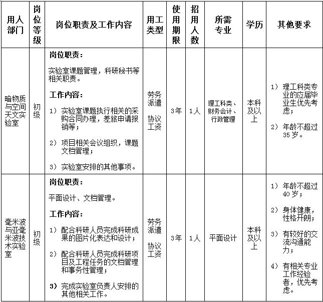 紫金山天文台面向国内外公开招用科研助理岗位人员,本次招用的具体岗位需求信息请见下表: